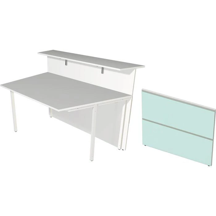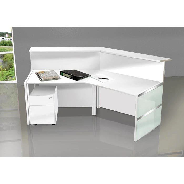 sonstiges: Theke bestehend aus 2 Thekenelementen, zwei Taschenablagen und zwei Seitenblenden, Arbeitsplatte 75 cm hoch mit zwei 60 mm Kabeldurchlassdosen, melaminharzbeschichtete E1-Qualitäts-Spanplatte, 2 mm starke ABS-Kanten, Arbeitsplatte, Ablageplatte und Seitenblenden 19 mm stark, Front mit zwei 20 mm hohen Edelstahlstreifen, Front- und Seitenblenden mit 4 mm starkem Einscheibensicherheitsglas, rückseitig weiß lackiert, Metallteile pulverbeschichtet
