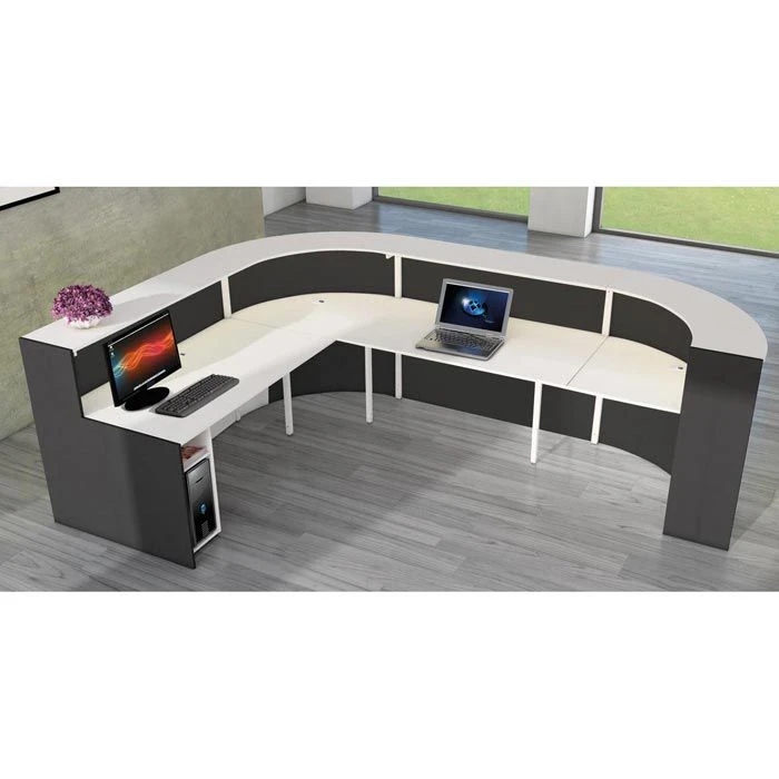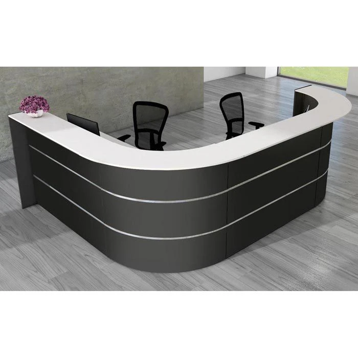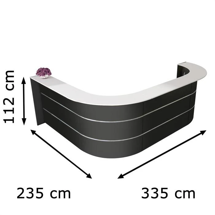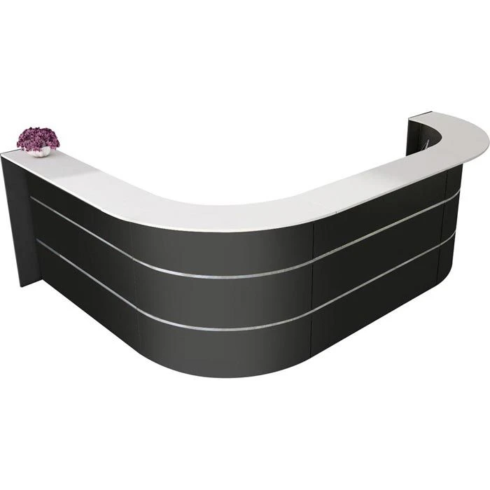 sonstiges: Theke bestehend aus zwei 90° Bögen und zwei geraden Thekenelementen, Ablage weiß, Seitenblenden anthrazit, Arbeitsplatte 74 cm hoch mit vier 60 mm Kabeldurchlassdosen, melaminharzbeschichtete E1-Qualitäts-Spanplatte, 2 mm starke ABS-Kanten, Arbeitsplatte, Ablageplatte und Seitenblenden 19 mm stark, Front mit zwei 20 mm hohen Edelstahlstreifen, Metallteile pulverbeschichtet