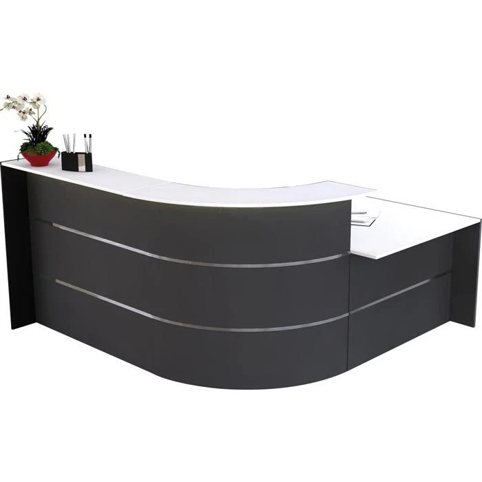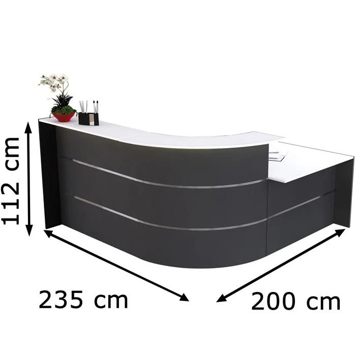 sonstiges: Theke bestehend aus 90° Bogen, geradem Thekenelement und Anbautisch, Ablage weiß, Seitenblenden anthrazit, Arbeitsplatte 74 cm hoch mit zwei 60 mm Kabeldurchlassdosen, melaminharzbeschichtete E1-Qualitäts-Spanplatte, 2 mm starke ABS-Kanten, Arbeitsplatte, Ablageplatte und Seitenblenden 19 mm stark, Front mit zwei 20 mm hohen Edelstahlstreifen, Metallteile pulverbeschichtet