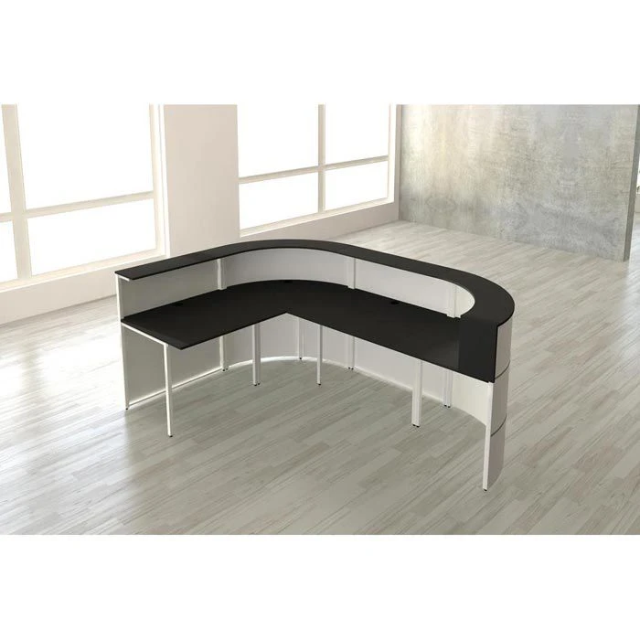 sonstiges: Theke bestehend aus zwei 90° Bögen und zwei geraden Thekenelementen, Arbeitsplatte 74 cm hoch mit 60 mm Kabeldurchlassdose, optimale Beinfreiheit durch zurückgesetzte Füße, melaminharzbeschichtete E1-Qualitäts-Spanplatte, 2 mm starke ABS-Kanten, Arbeitsplatte 19 mm stark, Ablageplatte und Seitenblenden 16 mm stark, Front aus Stahlblech mit 20 mm hohen Edelstahlstreifen, Metallteile pulverbeschichtet