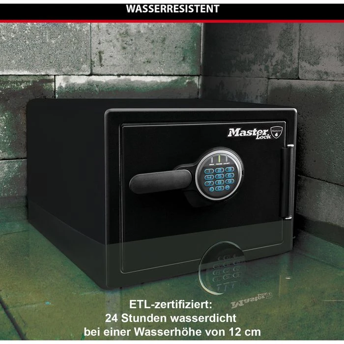 sonstiges: UL/ETL-geprüfter Brandschutz für 60 Minuten für Dokumente, amtliche Papiere sowie digitale Geräte (CD, USB-Sticks) bis zu 927 °C, ETL-zertifizierter Wasserschutz bis zu 12 cm für einen Zeitraum von 24 Stunden, Korpus aus massivem Stahl, innenliegende Scharniere