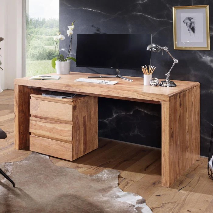 Der Schreibtisch besteht aus massivem Akazienholz mit lackierten Oberflächen.